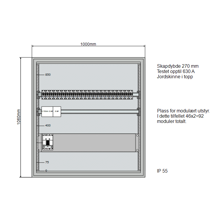 Fysiske mål: Bredde 1000 mm, Dybde 270 mm og høyde 1060 mm. Eaton modulskap system for opptil 160 A. Lagerført hos Onninen. Leveringstid typisk innenfor 1-2 uker fra bestilling ferdig bygd. Dersom det skal leveres i komponentpakke, kan det leveres over natten.