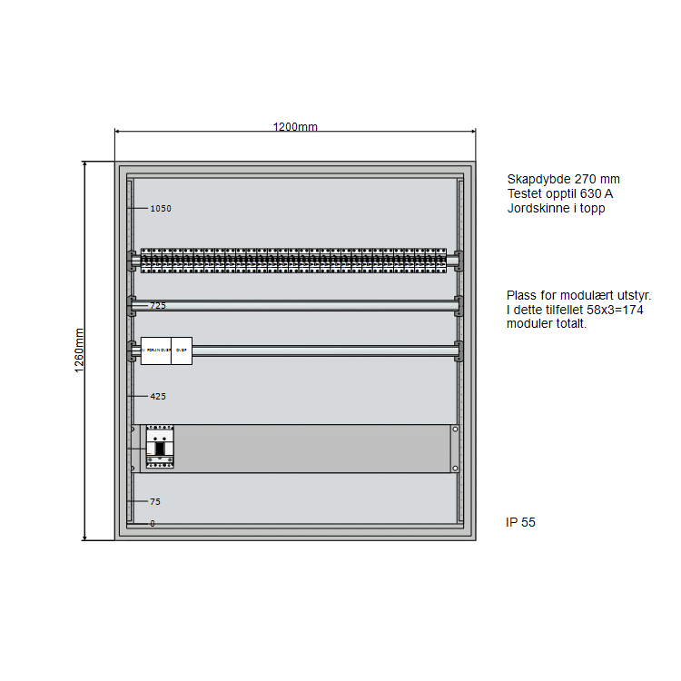 Fysiske mål: Bredde 1200 mm, Dybde 270 mm og høyde 1260 mm. Eaton modulskap system for opptil 160 A. Lagerført hos Onninen. Leveringstid typisk innenfor 1-2 uker fra bestilling ferdig bygd. Dersom det skal leveres i komponentpakke, kan det leveres over natten.