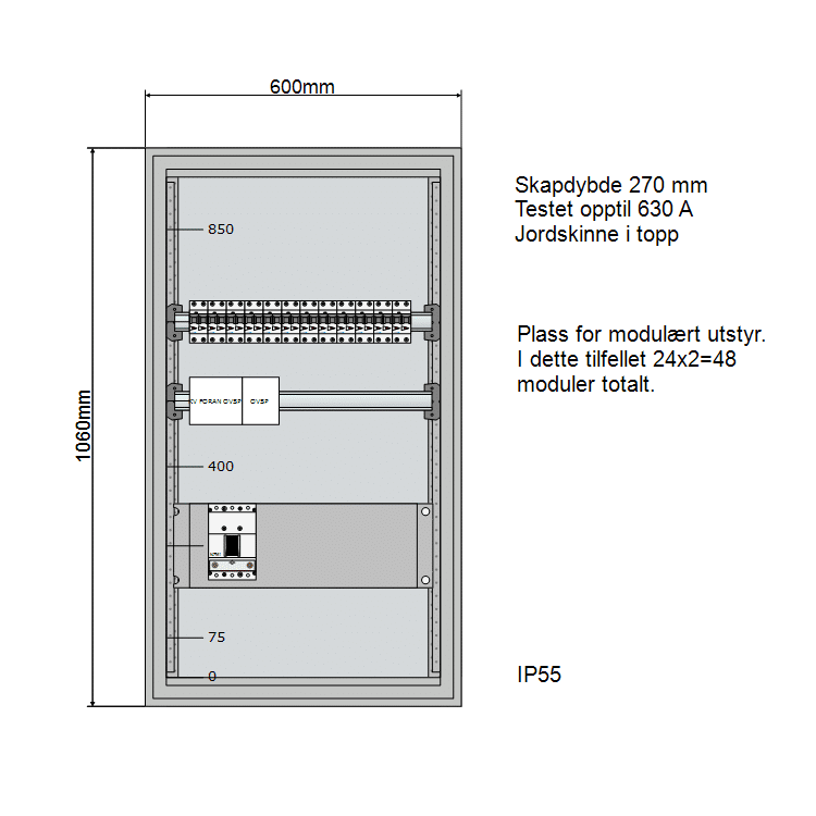 Fysiske mål: Bredde 600 mm, Dybde 270 mm og høyde 1060 mm. Eaton modulskap system for opptil 160 A. Lagerført hos Onninen. Leveringstid typisk innenfor 1-2 uker fra bestilling ferdig bygd. Dersom det skal leveres i komponentpakke, kan det leveres over natten.