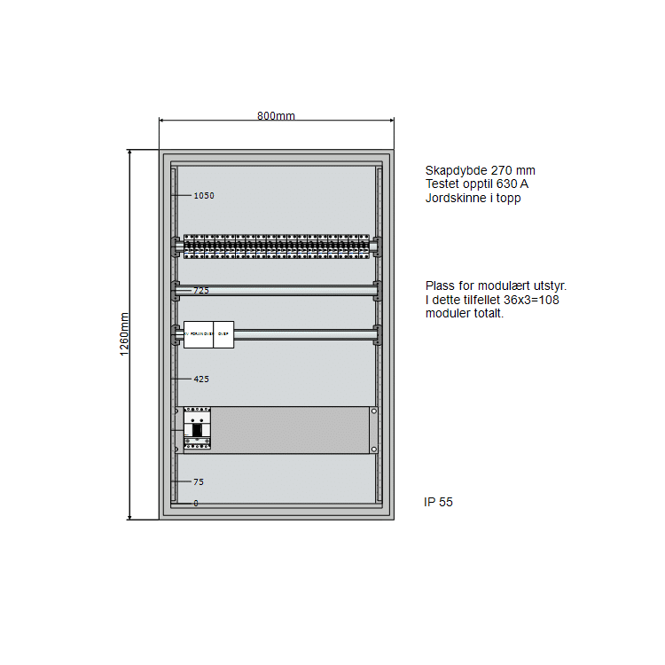 Fysiske mål: Bredde 800 mm, Dybde 270 mm og høyde 1260 mm. Eaton modulskap system for opptil 160 A. Lagerført hos Onninen. Leveringstid typisk innenfor 1-2 uker fra bestilling ferdig bygd. Dersom det skal leveres i komponentpakke, kan det leveres over natten.