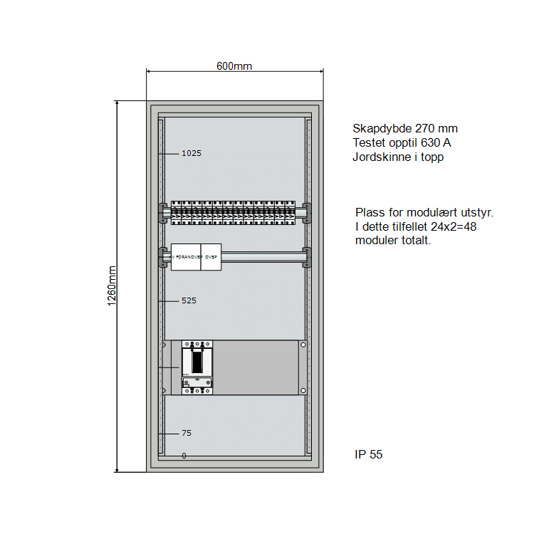 Fysiske mål: Bredde 600 mm, Dybde 270 mm og høyde 1260 mm. Eaton modulskap system for opptil 250 A. Lagerført hos Onninen. Leveringstid typisk innenfor 1-2 uker fra bestilling ferdig bygd. Dersom det skal leveres i komponentpakke, kan det leveres over natten.