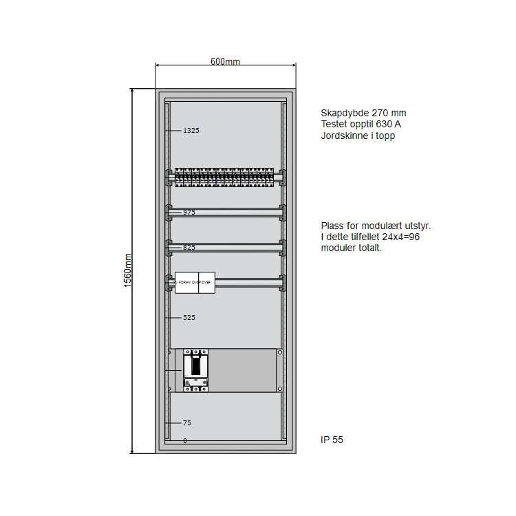 Fysiske mål: Bredde 600 mm, Dybde 270 mm og høyde 1560 mm. Eaton modulskap system for opptil 250 A. Lagerført hos Onninen. Leveringstid typisk innenfor 1-2 uker fra bestilling ferdig bygd. Dersom det skal leveres i komponentpakke, kan det leveres over natten.