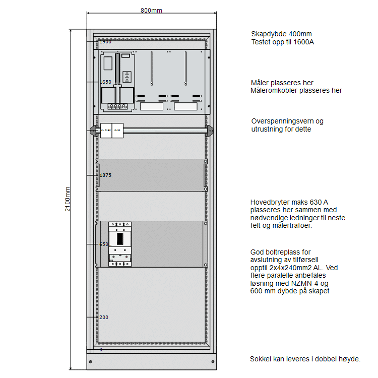 Fysiske mål : Bredde 800 mm, Dybde 400 mm og høyde 2100 mm med sokkel. Kan leveres uten sokkel. Lagerført hos Onninen. Leveringstid typisk innenfor 1-2 uker fra bestilling ferdig bygd. Dersom det skal leveres i komponentpakke, kan det leveres over natten. Pris er uten dør, men kan også leveres med dør på forespørsel.