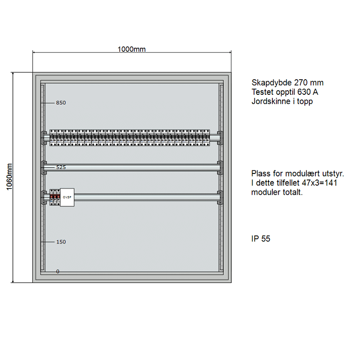 Fysiske mål: Bredde 1000 mm, Dybde 270 mm og høyde 1060 mm. Eaton modulskap system for opptil 125 A. Lagerført hos Onninen. Leveringstid typisk innenfor 1-2 uker fra bestilling ferdig bygd. Dersom det skal leveres i komponentpakke, kan det leveres over natten.