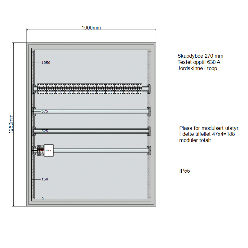 Fysiske mål: Bredde 1000 mm, Dybde 270 mm og høyde 1260 mm. Eaton modulskap system for opptil 125 A. Lagerført hos Onninen. Leveringstid typisk innenfor 1-2 uker fra bestilling ferdig bygd. Dersom det skal leveres i komponentpakke, kan det leveres over natten.