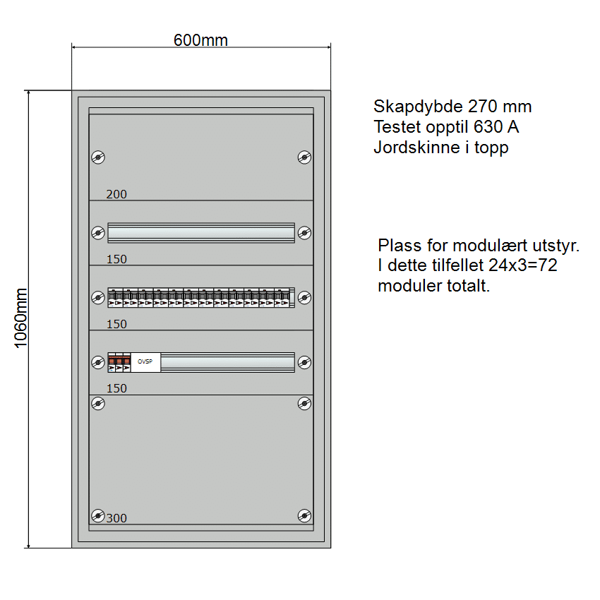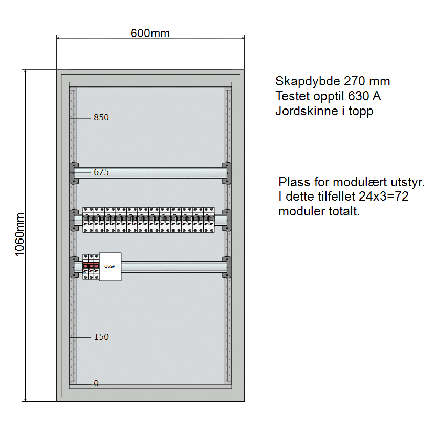 Fysiske mål: Bredde 600 mm, Dybde 270 mm og høyde 1060 mm. Eaton modulskap system for opptil 125 A. Lagerført hos Onninen. Leveringstid typisk innenfor 1-2 uker fra bestilling ferdig bygd. Dersom det skal leveres i komponentpakke, kan det leveres over natten.