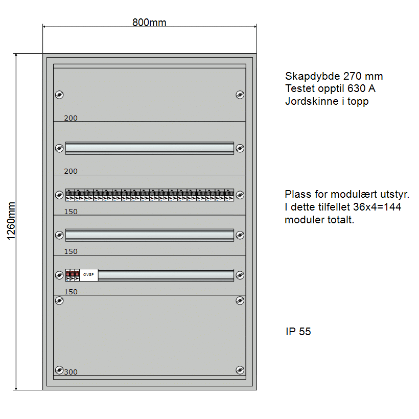 Fysiske mål: Bredde 800 mm, Dybde 270 mm og høyde 1260 mm. Eaton modulskap system for opptil 125 A. Lagerført hos Onninen. Leveringstid typisk innenfor 1-2 uker fra bestilling ferdig bygd. Dersom det skal leveres i komponentpakke, kan det leveres over natten.