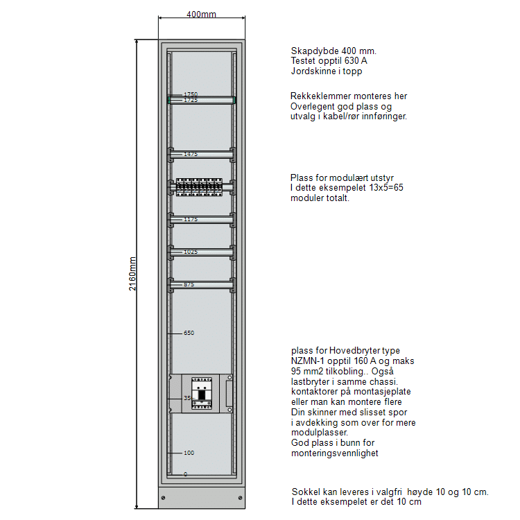 Fysiske mål: Bredde 400 mm, Dybde 320 mm og høyde 2160 mm med sokkel. Eaton basic underfordeling system for opptil 630 A. Lagerført hos Onninen. Leveringstid typisk innenfor 1-2 uker fra bestilling ferdig bygd. Dersom det skal leveres i komponentpakke, kan det leveres over natten.