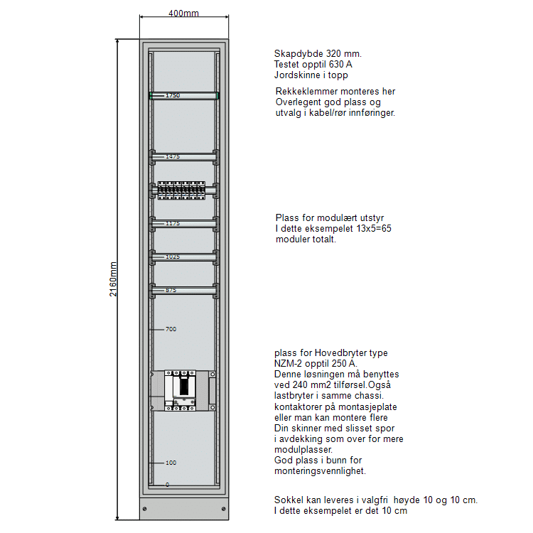 Fysiske mål: Bredde 400 mm, Dybde 320 mm og høyde 2160 mm med sokkel. Eaton basic underfordeling system for opptil 630 A. Lagerført hos Onninen. Leveringstid typisk innenfor 1-2 uker fra bestilling ferdig bygd. Dersom det skal leveres i komponentpakke, kan det leveres over natten.