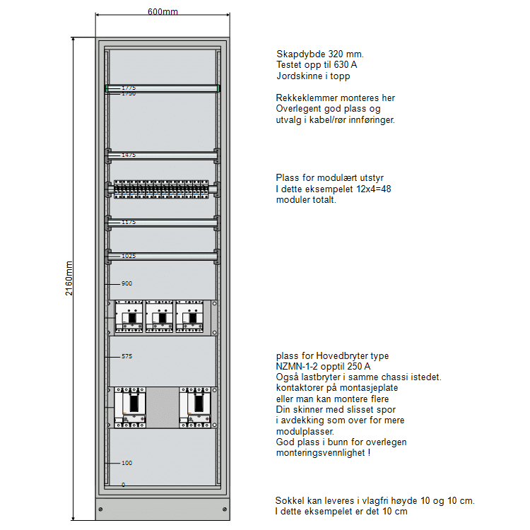 Fysiske mål: Bredde 600 mm, Dybde 320 mm og høyde 2160 mm med sokkel. Eaton basic underfordeling system for opptil 630 A. Lagerført hos Onninen. Leveringstid typisk innenfor 1-2 uker fra bestilling ferdig bygd. Dersom det skal leveres i komponentpakke, kan det leveres over natten.