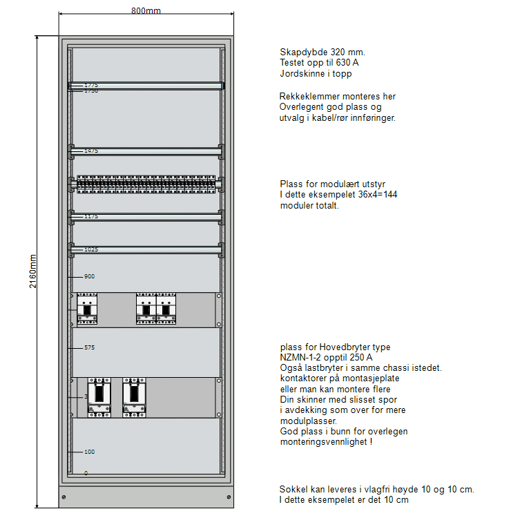 Fysiske mål: Bredde 800 mm, Dybde 320 mm og høyde 2160 mm med sokkel. Eaton basic underfordeling system for opptil 630 A. Lagerført hos Onninen. Leveringstid typisk innenfor 1-2 uker fra bestilling ferdig bygd. Dersom det skal leveres i komponentpakke, kan det leveres over natten.
