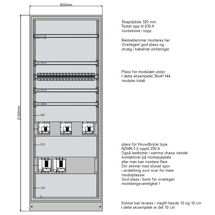 Fysiske mål: Bredde 800 mm, Dybde 320 mm og høyde 2160 mm med sokkel. Eaton basic underfordeling system for opptil 630 A. Lagerført hos Onninen. Leveringstid typisk innenfor 1-2 uker fra bestilling ferdig bygd. Dersom det skal leveres i komponentpakke, kan det leveres over natten.