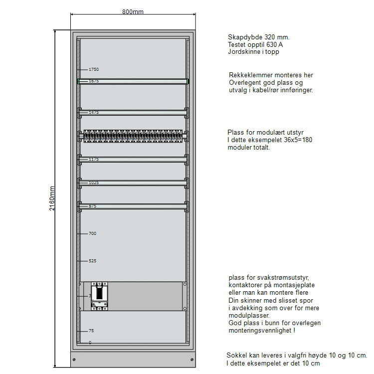 Fysiske mål: Bredde 800 mm, Dybde 320 mm og høyde 2160 mm med sokkel. Eaton basic underfordeling system for opptil 630 A. Lagerført hos Onninen. Leveringstid typisk innenfor 1-2 uker fra bestilling ferdig bygd. Dersom det skal leveres i komponentpakke, kan det leveres over natten.