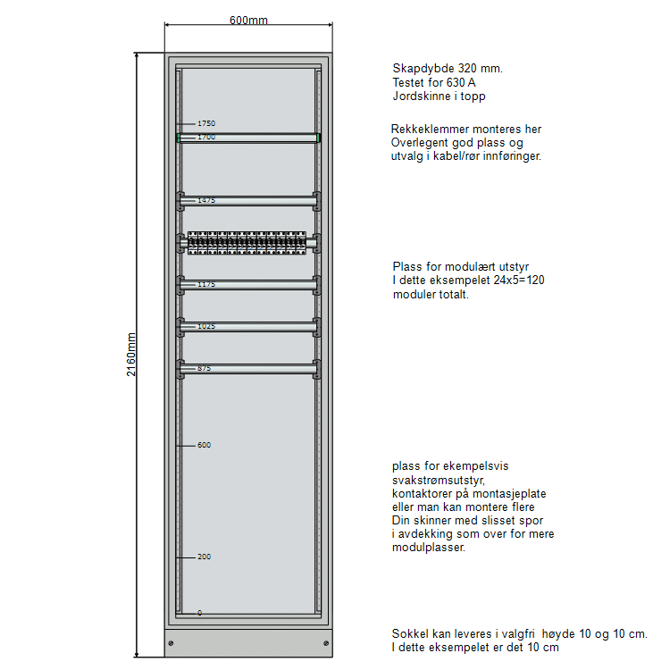 Fysiske mål: Bredde 600 mm, Dybde 320 mm og høyde 2160 mm med sokkel. Eaton basic underfordeling system for opptil 630 A. Lagerført hos Onninen. Leveringstid typisk innenfor 1-2 uker fra bestilling ferdig bygd. Dersom det skal leveres i komponentpakke, kan det leveres over natten.