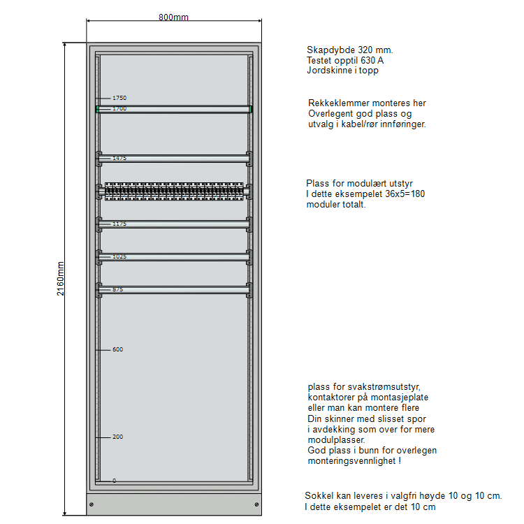 Fysiske mål: Bredde 800 mm, Dybde 320 mm og høyde 2160 mm med sokkel. Eaton basic underfordeling system for opptil 630 A. Lagerført hos Onninen. Leveringstid typisk innenfor 1-2 uker fra bestilling ferdig bygd. Dersom det skal leveres i komponentpakke, kan det leveres over natten.
